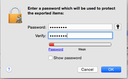 In the next screen you have the option to enter a password. If you put a password on your P12 certificate you will have to include it when you send your certificate and provisioning profiles to branding@owncloud.com. Click OK.