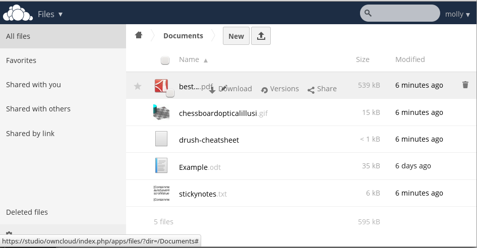 Upload button: Located next to the New button in the Navigation Bar, the Upload button opens a file picker for uploading files from your system to the ownCloud server.